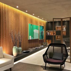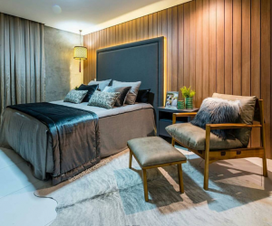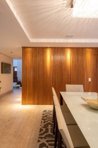 Os painéis de madeira oferecem sofisticação, ajudam a melhorar o conforto acústico e podem ser usados para revestir paredes e criar ambientes mais acolhedores.